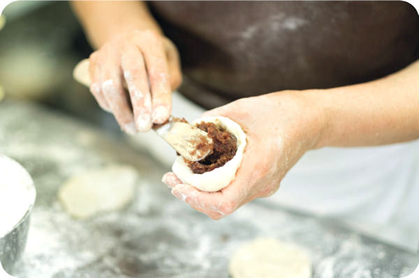湯こね生地にたっぷり餡をつつむ もちもち食感にこだわり「ぬちまーす」入りの湯こね生地に自慢の餡をたっぷり包み込みます。 |