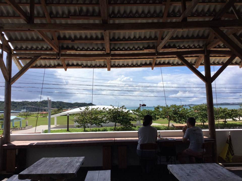 海とサンセットが見えるテラス席では店内で購入したパンやピザ、カレーをお召しあがりいただけます。 |