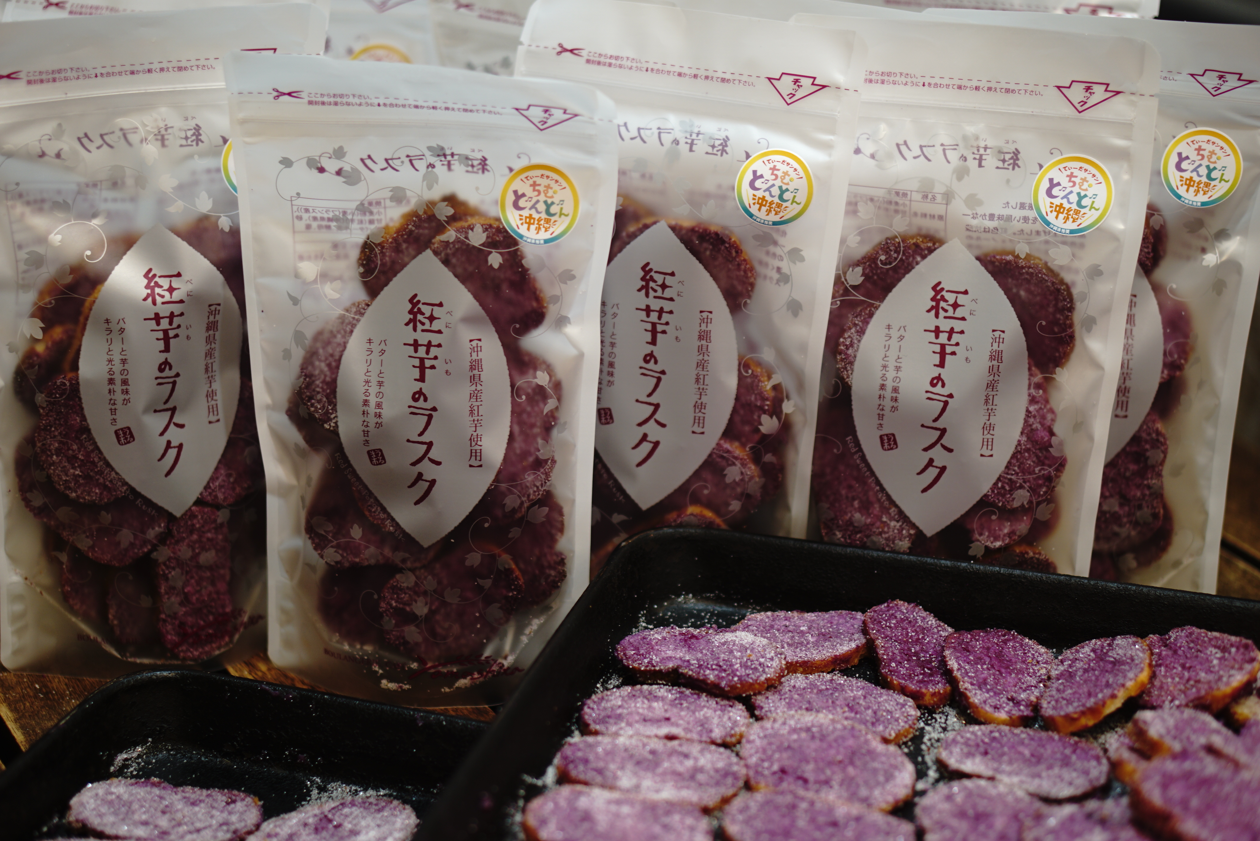 紅芋のラスク 紅芋の中から厳選した「美ら恋芋」を使い、風味豊かな一品に仕上げました。 紅色は抗酸化作用の高いポリフェノールの一種であるアントシアニン由来の色素です。 加熱によりさらに濃く色鮮やかな極上の紅芋のラスクをお楽しみください。 |